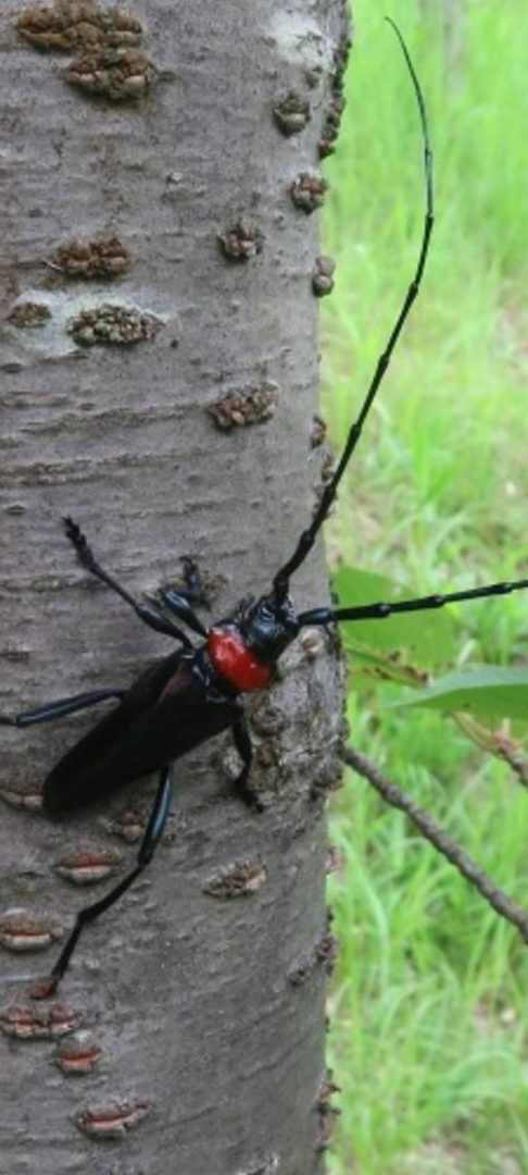 『クビアカツヤカミキリ』はサクラ、モモ、スモモなどバラ科の樹木に寄生し、幼虫が木の内部を食い荒らすため、寄生された樹木は衰弱し、やがて枯れてしまいます。