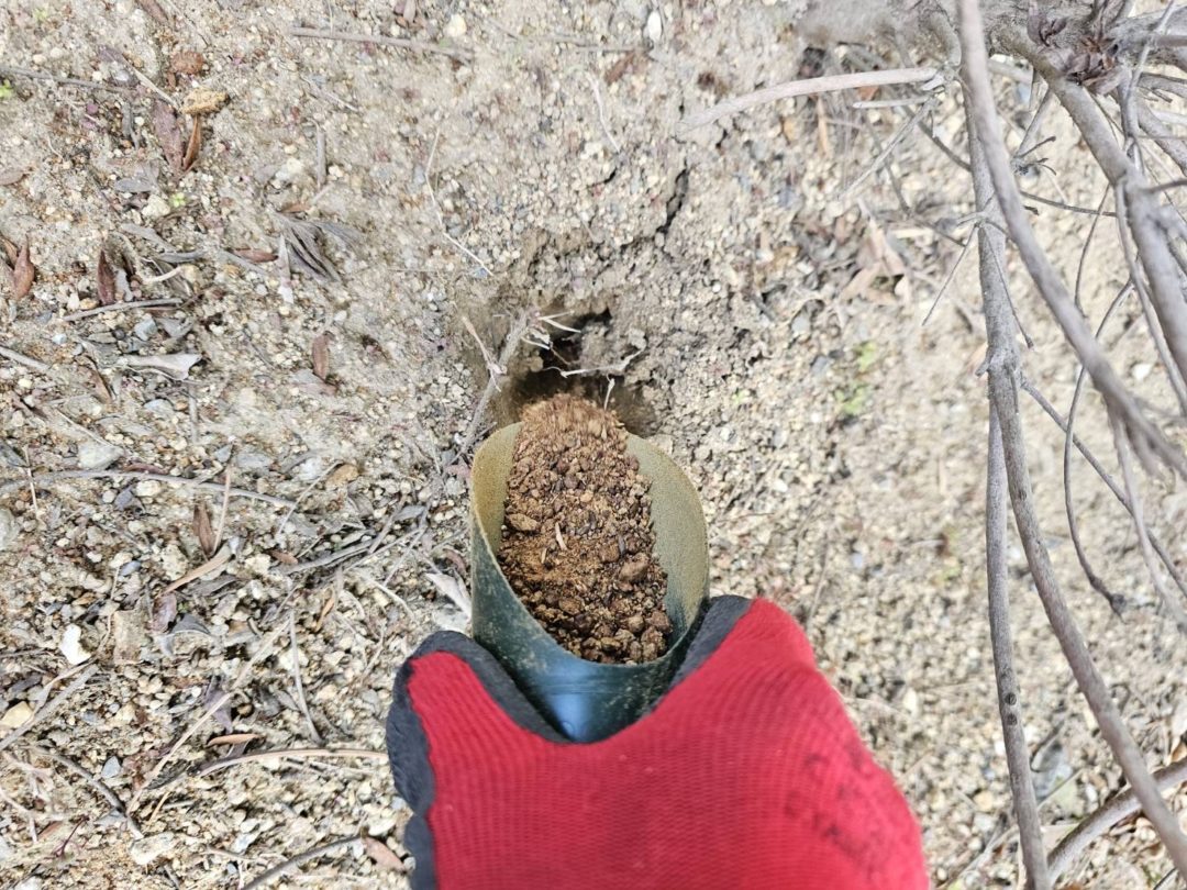 枝が伸びている所で穴をあけ、その穴の中に油かすを入れます。